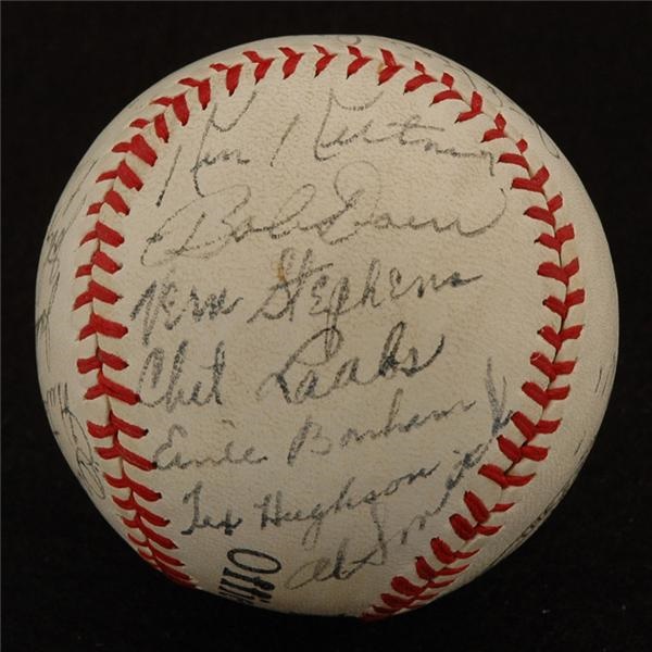 The 1943 All-Star game at Shibe Park in Philadelphia was the first to be held under the lights and featured the debut of Stan Musial in the first of his many appearances. He did not disappoint, driving in a run in his first at bat, but it wasn’t enough as the AL came back to take the tilt, the eighth year in a row that the AL had triumphed. The 19 signatures (all in the same fountain pen) on this Reach Official League baseball feature Bobby Doerr, Vern Stephens, Ken Keltner, Luke Appling, Rudy York, Hal Newhouser, Joe McCarthy, Bill Dickey. Signatures average 8/10, while unofficial ball is NRMT-MT. Comes with LOA.