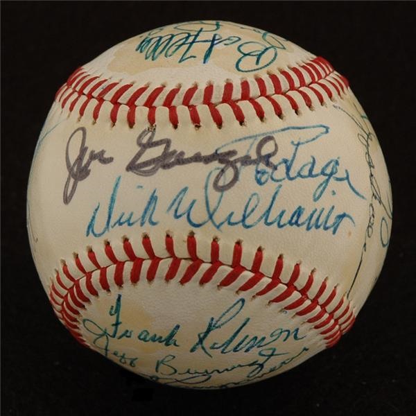 In 1974, the All-Star Game came to the beautiful new ballyard of the Pittsburgh Pirates, Three Rivers Stadium. Official American League ball with the stamp of AL president Joe Cronin features AL greats plus outstanding old-timers and a diminutive actor. Players include Thurman Munson, Al Kaline, Frank Robinson, Earl Weaver, Brooks Robinson, Carlton Fisk, Rollie Fingers, Rod Carew and Gaylord Perry. Famous attendees Bob Feller, Curt Gowdy, Happy Chandler, Ralph Kiner and Mickey Rooney also signed. The twenty two signatures average 9/10 and each is covered by a light coating of shellac. Ball is NRMT but for the slight yellowing the shellac has caused. Comes with LOA.