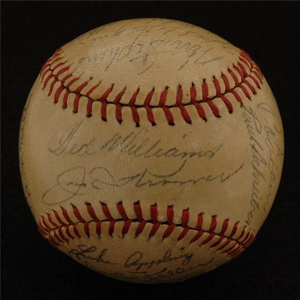 The fans were ecstatic at the 1946 All-Star Game in Boston. The war was over and America could once again enjoy the national pastime. The highlight of this game was the match-up of Ted Williams and Rip Sewell, the proud possessor of the “ephus” pitch. Sewell served Williams his famous trademark and although he struggled at first, he went four-for-four, driving in five runs. The 23 signatures include Teddy Ballgame, Bob Feller, Bobby Doerr, Luke Appling, Joe Gordon, Bill Dickey, Ken Keltner, Vern Stephens and Charlie Keller. The signatures average 6/10, while ball is evenly toned to a pleasing EX.