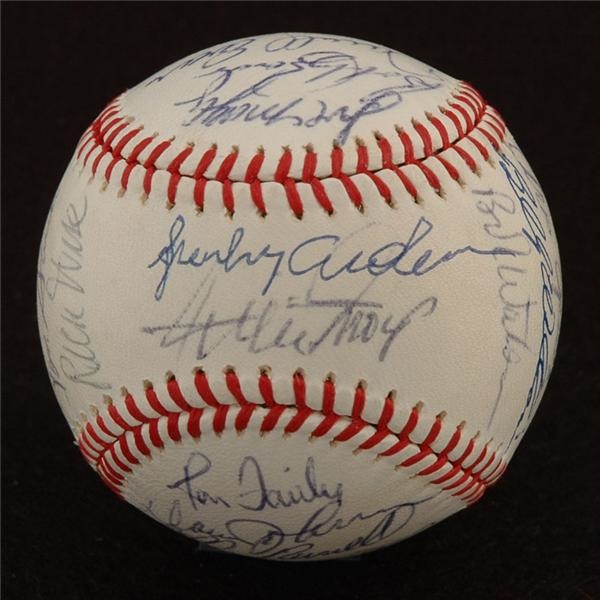 The 1973 All-Star game represented the 40th anniversary of the tradition. Another reason it was special was that it marked the 24th and final time that the great Willie Mays would participate. During that span it sometimes seemed that it was a showcase for his all around talents. The American League took an early lead, but was unable to hold onto it. Trailing 1-0 in the third, the National League scored two runs and never looked back. While this official AL ball (Cronin) bears the signatures of some great National League ballplayers from the game, there’s more to it than just that. Many of the signatures are from future Hall of Famers. Willie Mays, Sparky Anderson, Billy Williams, Johnny Bench, Joe Torre, Ron Santo, Joe Morgan, Bobby Bonds, Hank Aaron, Pete Rose, Tom Seaver, Don Sutton and Willie Stargell. 26 signatures in all. Autographs are 8-9/10 while ball is NRMT-MT. Comes with LOA.