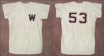 Wondrous baseball flannel worn in the Bob Fosse baseball musical Damn Yankees. Based loosely on the story of Shoeless Joe Jackson, it is a great film and this is an even better jersey. Triple-layered "W" felt crest on the front and "53" on the verso in red, white & blue. White pinstripe style is engaging and is in EX-MT condition. "Tim McAuliffe" & "44" tagging with the all-important Western Costume "Wash. Home Team 1957" stamp in black.