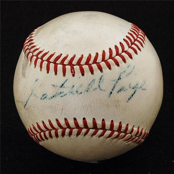 Official William Harridge AL baseball has a playing days signature of Paige on the sweet spot. The blue ball-point autograph is a bit broken up, but still displays well. Ball is off-white and in Ex-Mt shape. Was obtained when Paige was a member of the Cleveland Indians in the late 1940’s. This rare single comes from the same source as our Jackie Robinson baseball which you will find earlier in our auction catalog.