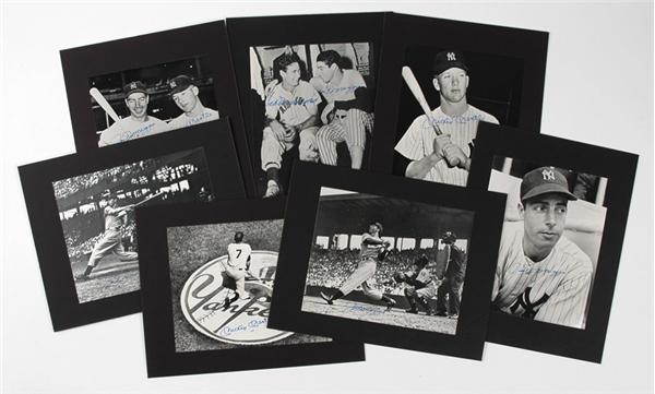 The consecutive owners of center field in Yankee Stadium along with the dominant sports figure of 20th century New England. Photos are: Mantle posed with bat on shoulder, DiMaggio and Williams sharing a laugh in the locker room, Mantle and Williams holding bats and smiling, a pensive Joe D, Mantle kneeling in the on deck circle, and 2 of DiMaggio following the flight of a ball he has just smashed. Four photos are 8 x 10” and the other three are 10 x 8”