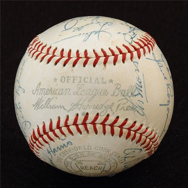 Official Reach ball with AL president William Harridge’s stamped signature has twenty eight signatures, including Waitkus, Kennedy, Young, Smith, Woodling, Richards, Kretlow, Cox. Sigs are all 9/10.  A great, early Orioles ball from their second ML season. NRMT to MT condition.