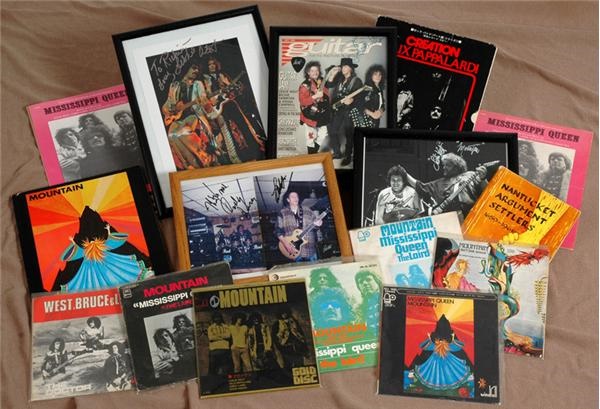 A gallery of framed items include: a Leslie West Guitar magazine cover shot, signed by West; a pair of 5” x 7” color photos of West and Laing, signed by each; an 8” x 10” black & white promo shot, signed by West and Laing; an 8” x 10” color photo, signed by West; a tour Program, England 1971; Disc magazine front page, May 1971; collection of 10 different Leslie West guitar picks; “Mississippi Queen” sheet music, signed by West.