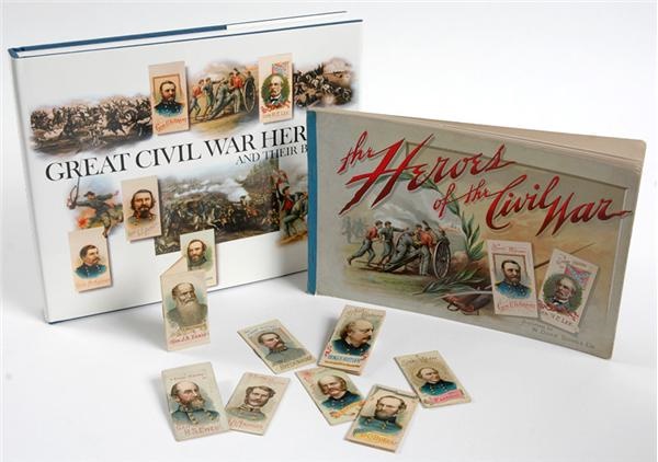 Dating from 1888, the N78 Heroes Of The Civil War Card Set consists of fifty (50) cards, 2 5/8" x 1 1/2", and an absolutely spectacular 56-page Album, 10 3/8 X 6 3/4". These items were originally offered as premiums by the W. Duke & Sons Tobacco Company. Each card presents a color lithograph of a prominent Civil War general, backed by thin attached pages providing a concise history of their role in the war; the fifty cards are divided equally between Union and Confederate generals. The Album provides additioanl lithographs, including action scenes, supported by vivid textual descriptions. This magnificent group is widely considered to be the most desireable of all non-sports card sets, and it is highly unusual to find an offer of set in its entirety. That the extremely scarce Album / Premium Book is included in the set makes this, literally, a "once-in-a-lifetime" find. Condition of the cards ranges from solid VG to Near-Mint or better, with the key General Robert E. Lee and U.S. Grant cards rated as EXC. Of the fifty cards, only one shows light creasing, and 2-3 have small pinholes. The extremely rare Album is Near Mint, with only a bit of wear at the spine and slight rounding of the corners. The interior pages are pristine, and it is likely that the album was rarely opened. An opportunity to own perhaps the finest known complete set of these historically significant items.