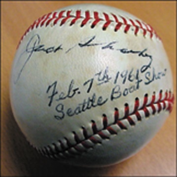 Both of these guys could really hit. The Baseball and Boxing HOF'ers join forces on this non-official ball signed at a Seattle boat show. Blue ink sig's are NRMT.