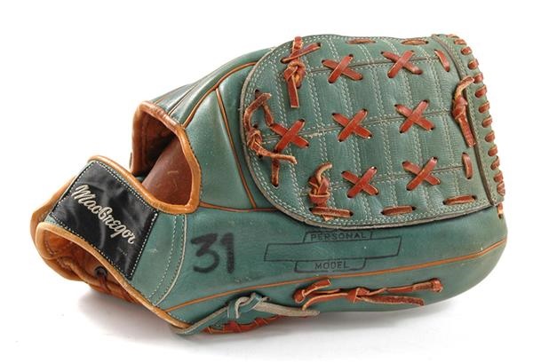 Hall-of-Famer Fergie Jenkins won 20 or more games for six consecutive seasons. Playing for the Chicago Cubs, Jenkins went 24-13 in 1971, receiving the Cy Young Award for his achievements. This fabulous glove, green with brown lacing, is signed boldly by Jenkins in black ink, and is marked on the outside fingers, also in black ink: “Cy Young 1971...24-13”. Jenkin’s “#31” is marked at the base of the thumb. Great signs of game use - a wonderful item from a terrific season.