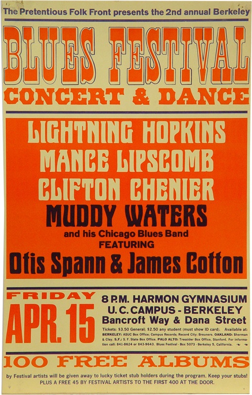 1966 Poster from the 2nd Annual Berkeley Blues Festival. Phenomenal All-Star line-up, featuring Muddy Waters, Lightning Hopkins, Otis Spann, James Cotton, Mance Lipscomb & Clifton Chenier. And all for only $3.50! H - 20” x W - 13”, printed in black and red on heavy yellow card stock. Condition NRMT, except for tack holes in each corner and a bit of tape and a shallow dent in the extreme upper left corner.