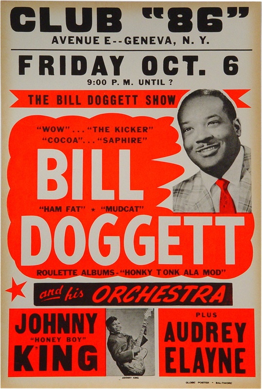 This multi-talented jazz keyboardist had an early hit with the 1956 song “Honky Tonk”. His seven decade career continued until his death in 1996. This rare Globe Poster showcases The Bill Doggett Show at Club “86” in Geneva, New York back in 1961. Aside from the main photo featuring Bill Doggett, there’s a photo of Johnny “Honey Boy” King. The poster measures 17” x 26” (approx) and is in terrific condition. There is slight brown aging around the borders and no folds. Here’s a rare opportunity to remember one of America’s jazz and blues legends. Bottom of Form 0