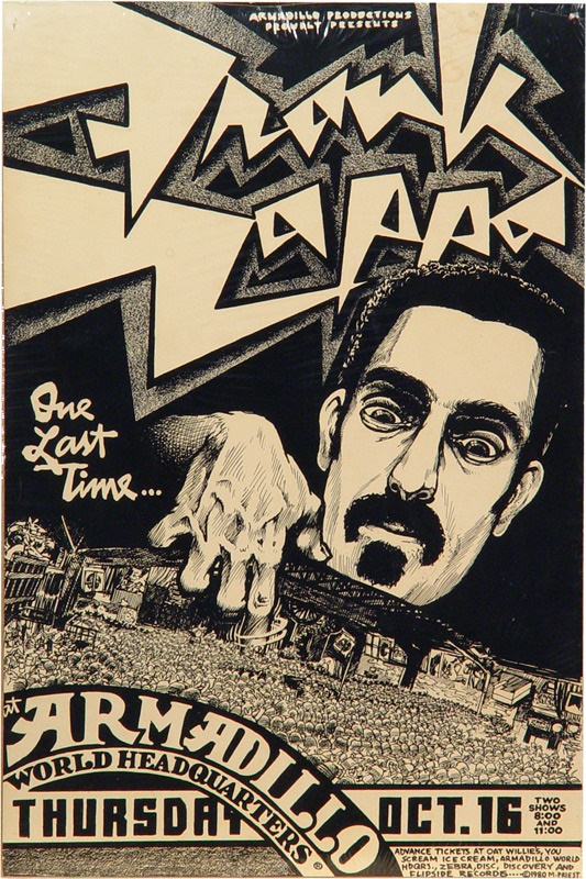 I couldn’t say where she’s comin’ from, but I just met a lady named Dinah-Moe Humm. Zappa wrote lyrics that operated on a different wavelength, but to his fans he was a god of music. On August 7, 1970, Eddie Wilson opened the Armadillo World Headquarters in Austin. On New Year’s Eve, 1980, Kenneth Threadgill played the last concert. During its ten year run the Armadillo was the venue to play in Texas, hosting many local and national acts. There was a beer garden outside, and the inside was cavernous. People had to sit on the carpeted floor with the smell of beer and ashes from previous performances. Poster is ad for Zappa’s two upcoming shows of “One Last Time” on Oct. 16, 1980. Size is 11 X 17” and it is drawn in India ink.
