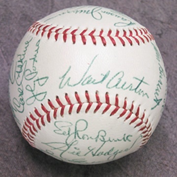 You won't find one nicer than this-such a ball doesn't exist. Absolutely perfect ONL (Giles) ball with twenty-two 10/10 signatures is the perfect goodbye to the borough of Brooklyn. Campy, Erskine, Alston, Furillo, Reese, Snider, Hodges, Koufax and Zimmer are just some of the names of this last team at Ebbets.