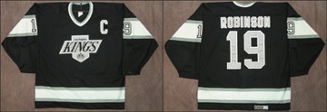 Late Eighties LA Kings road black game worn jersey worn by Hall-of-Famer Larry Robinson. Regal "Kings" crest across the front with his temporary captain's "C" attached with velcro. Maska Ultrafil tag in collar, "Robinson…19" on the verso. Older style CCM logo on the tail with no NHL shield (pre-1990). Light use on the outside, good pilling above the elbows and around the fight strap on the inside.