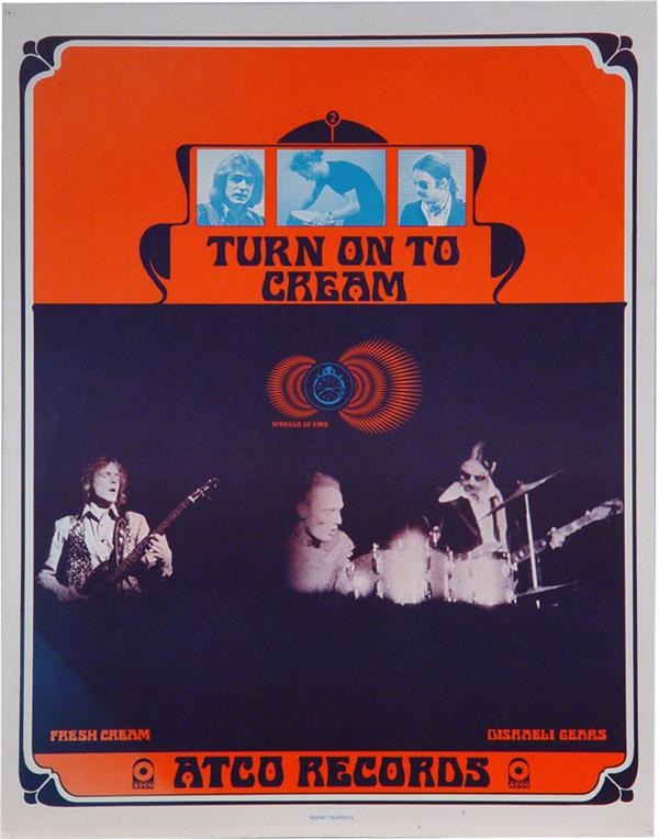 Straight from the late ‘60’s, this set of two posters and an original promo still features the legendary group Cream. From the release of “Fresh Cream” in 1966 to the band’s breakup in November, 1968, Cream defined the potent edge where psychedelia met the blues. The first poster, 17 1/2” x 22 1/2”, red, black and halftone on heavy white card stock, is from Atco Records and refers to the albums “Fresh Cream” and “Disraeli Gears”, also including small photos of the members, as well as a superb concert shot. The second poster, 36 1/2” x 24”, blue and black on white paper, has a closeup of the three musicians, with Atco announcing Cream could now be obtained in 8-track cartridge, 4-track cartridge and cassette. The last item, an 8 X 10 black and white labeled photo, provides a great shot of the group in ‘60’s regalia. Condition is NRMT, with the larger poster folding to 8” x 12”, and the smaller poster showing tack holes in each corner.