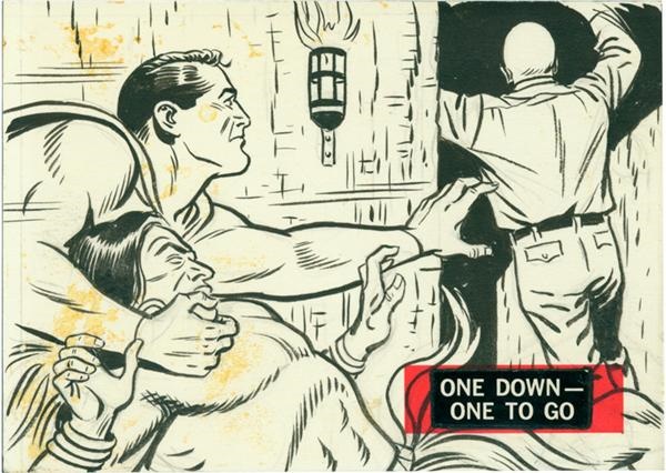 It’s clear from this original piece of art from the Topps 1966 card series “Superman in the Jungle” that nobody gets away from the Man of Steel. The artwork for the 66-card series was masterfully drawn in black ink by the master himself, Superman comic illustrator Norman Saunders. After he drew the pieces, Norman had do some adhesive-backed cut and pasting, which is why there are a few yellow adhesive stains on the front, and, of course, on the back. This black & white card allows fans to see --and feel--Superman in his original pre-printed state.