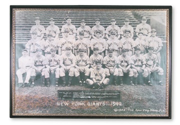 Giant Giants photo likely hung in the clubhouse of the famed Polo Grounds, inspiring future players from Bobby Thomson to Willie Mays. Hubbell, Mize and Ott are among the Hall of Famers pictured in this impressive shot, snapped by the photographers of The Sporting News and then enlarged for posterity. Defects such as foxing and light tears are only visible from very close range and, if anything, only serve to add vintage appeal. There's no way you'll be disappointed.