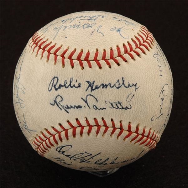 This hard-luck club for years was known for below average play on the field but stellar performances after hours. “First in shoes, first in booze and last in the American League” became the dubious rallying cry of fans of this hapless bunch. This unofficial Browns baseball is EX-MT while the signatures are in 7/10 blue ink. the horsehide-covered ball is slightly discolored. The signatures are all legible. A few are slightly smudged. There is minimal scuffing on the ball. The signature of Hall of Fame first baseman Jim Bottomley, who managed the 1937 club for 80 games and also did some pinch hitting, is located just to the right of the sweet spot of the ball where the year ‘1937’ is written in ink beneath the label. Players Joe Vosmick, Ethan Allen, Beau Bell, Rollie Helmsley and Harry Davis also signed the ball.