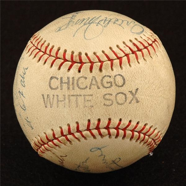 The best of the best White Sox from the first half of the 20th century. Ray Schalk, Ed Walsh, Red Faber, Luke Appling, Minnie Minoso, Ted Lyons, Monty Stratton, a total of 19 signatures. Unofficial “White Sox” ball was signed in the 1950’s at Comisky Park. Ball is EX while signatures average 7-8/10.
