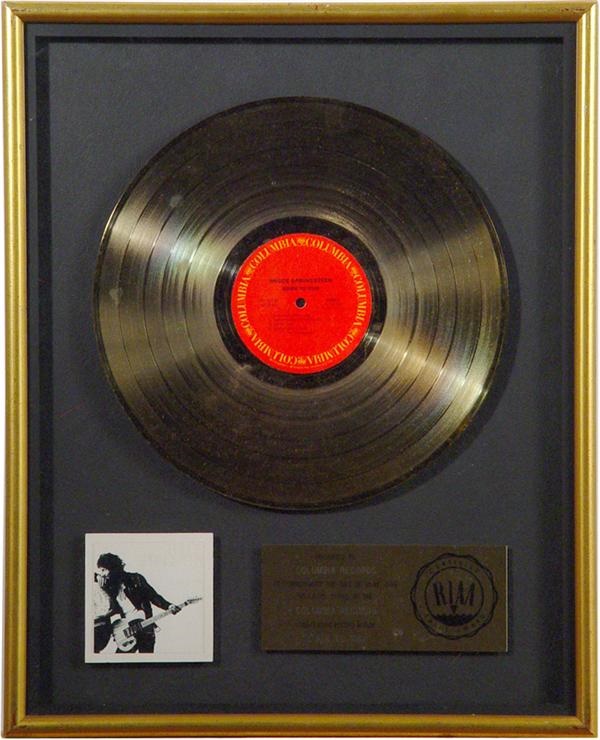 If you weren’t a Bruce fan before Born to Run came out, you certainly were one afterwards. Considered by many to be the classic rock ‘n roll record of the 1970s and his pantheon work. Features some of the finest rock ‘n roll songs ever recorded and marked Bruce’s transition into the big time with his bringing Jon Landau into the mix and pushing out neophyte Mike Appel. This RIAA gold record was presented to Columbia Records to commemorate the sale of more than 500,000 copies of the long-playing record album. Disk is under glass in a gold frame and has a miniature copy of the album cover in the lower left corner alongside the plaque from RIAA. NRMT and a must have for any fan of the Boss.