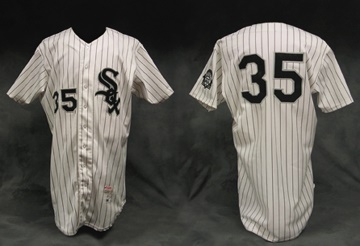 A future Cooperstowner, The Big Hurt put up big numbers this year, leading the league with 106 runs and recording a career high .353 batting average. And it's a good bet he took a few free rides around the bases in this home gamer, as he clubbed thirty-eight long balls this year. "Sox 35" across chest; "35" on verso. Patches on left and right sleeve are "Comiskey Park" and "125th Anniversary" respectively. Tagging in tail is "Wilson [size] 46" with "94" year tag.