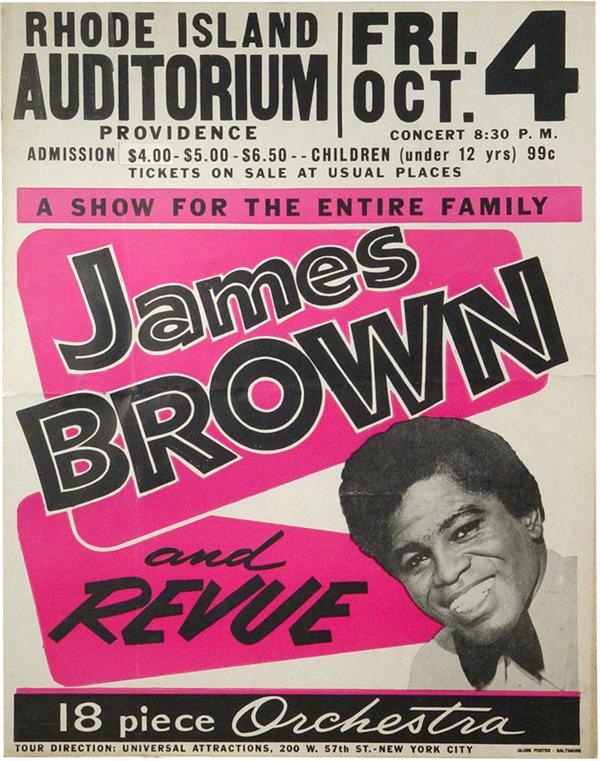 “Boxing style” posters were fashioned after the “Fight Night” posters of the ‘30s, ‘40s and ‘50s. The printers of these posters announcing the lineups at the boxing matches were employed to create concert posters for blues musicians in the mid ‘50s. To make it simpler for themselves, they adapted the boxing style posters to their new business of concert promotion. This poster is trumpeting James Brown and Revue coming to the Rhode Island Auditorium in Providence on October 4, 1968, along with an 18 piece orchestra. Vintage cardboard poster advertising “a show for the entire family.” James Brown and Revue with 18 piece Orchestra. Poster is 22 X 28” and was once folded near the center. Get up, get on up and feel good.