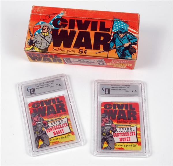 Nearly a half-Century old and a striking find for any Civil War buff, this 1962 Topps issue is available in this lot of two unopened packs, each Graded NM+ 7 by GAI. A display box of remarkable integrity showing only slight signs of use and wear is included.