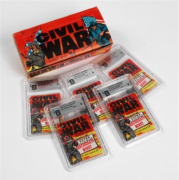 In 1962, when Topps released this Civil War News issue coincident with Civil War Centennial fever, they were mastering their craft. Following the public outcry about their earlier “Mars Attacks” release, our favorite pranksters responded with this Civil War News set which seemed to be in earnest but, given the apparently historical but mostly fictitious “news” items on the backs, was very much tongue in cheek. Available in this lot are five unopened packs, each Graded Mint 9 by GAI. A Display Box in about excellent condition is included.