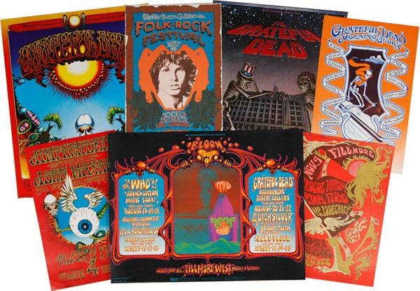 Deadheads everywhere will greatly appreciate the variety of outstanding posters in this offering. 1.) dating from an extended gig at San Francisco’s Warfield Theatre, Sept 25 - October 14, 1980, with spectacular graphics and the famous marquee “They’re not the best at what they do, they’re the only ones that do what they do.” Created by famed Fillmore stage designer Dennis Larkin and Fillmore house artist Peter Barsotti, this poster is the rare first printing, and appears in The Art of Rock, p. 345, Ref. # 4.45. Multicolor on card, 19 1/2” x 28”; 2.) dating from 1968, and designed by celebrated poster artist Bob Fried, known as the “Trip and Ski”. This poster is quite rare, and announces a Feb. 22-24 concert at the Kings Beach Bowl in Lake Tahoe. Blue, black and orange on white card, 14” x 22”; 3.) 1969 Hawaii concert, “It’s A Beautiful Day”, rare 2nd printing. Multicolor on white paper, 12 1/4” x 20”; 4.) 1969 Avalon Ballroom show, by poster artist Rick Griffin, rare numbered European 2nd Edition, 1976. Multicolor on white paper, 22” x 26 1/2”; 5.) 1968 Fillmore West, also advertising The Who, Creedence, Albert Collings, Quicksilver and others. AOR BG 133, First Printing. Multicolor on white card, 22” x 28 1/2”; 6.) Nine (9) copies of a Madison Square Garden concert poster, with sensational King Kong pounding his chest atop the Garden. Multicolor on white paper, 16 1/2” x 24”; 7.) Five (5) copies of 1967 Grateful Dead Fan Club poster, “The Golden Road to Unlimited Devotion”, AOR 2.192. Blue, green & black halftone on white card, 14” x 20”.