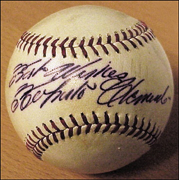 One of the very nicest single signed Clemente balls we've seen. ONL (Feeney) ball is just a bit age-toned, but the sweet spot inscription, "Best Wishes, Roberto Clemente" is just perfect. It's as dark as the day it was penned. Dozens and dozens of times as rare as a Ruth ball. How many have you seen?