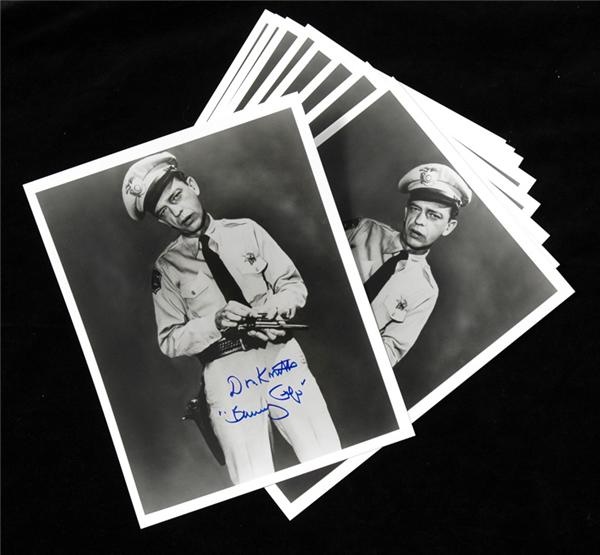 Nip it in the bud. In the entire history of television, one comedic character stands head and shoulders above the rest. His name, Barney Fife, ace deputy under Sheriff Andy Taylor on the Andy Griffith Show. If you doubt this, try picturing the show without him. What you’d have left is a bunch of fair to middling characters with not a magnetic personality among them. Goober, Gomer, Opie, Aunt Bea, Andy, Thelma Lou and Helen Crump do not make for compelling television. Who could sing a capella better than Barney crooning “A capella, A capella, A capella.” Simply awesome. We offer 193 8 X 10” b + w photos of Barney, his head cocked menacingly to the side, that steely stare throwing a shiver into all who fell under his gaze, while he loads his oh so lethal pistol. Knotts signed all of these as both Don Knotts and Barney Fife, in blue marker. Barney had a special way with words; Inkem binkem notamus rex, protect us all from the man with the hex. How can you argue with that?