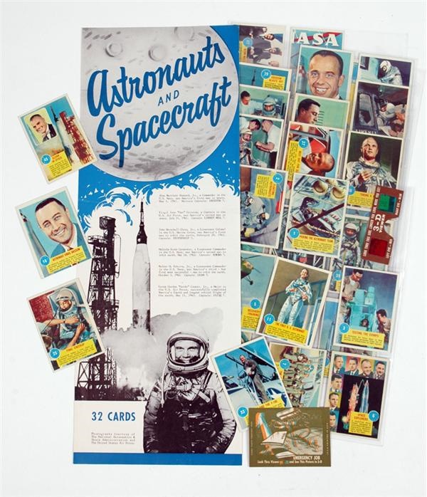 …But why, some say, the moon? Why choose this as our goal? And they may well ask why climb the highest mountain? Why, 35 years ago, fly the Atlantic? Why does Rice play Texas? - President Kennedy talking about the space program. In the 60’s, America got space crazy. The race was on with the Soviet Union to “conquer” space and all Americans followed the program closely. The fascination led to the issuing of NASA space program cards in 1963 by Topps. Here we have almost a complete set of these cards and the front sheet of a vending machine from where you could purchase them. Sheet has short bios of America’s first astronauts and is 7-1/4 X 19-1/2”. On the front of each card is a photo of either astronauts or NASA training. On the reverse, 3D drawings that can only be viewed by special glasses and they’re included with this lot. Cards show Glenn, Carpenter, Cooper, Grissom, Schirra and Slayton in action. This is the right stuff.