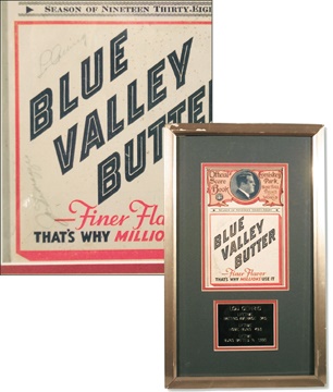 Cover of this attractive Comiskey Park scorecard sold to a fan visiting to watch the White Sox take on the Yankees is signed in NRMT pencil on the cover by the Iron Horse and his young protege Joe DiMaggio. Attractively matted and framed with a window on back to allow access to more autographs from Bill Dickey and three others playing that day. This is the kind of collectible we wish our fathers and grandfathers had gotten as kids. Pure americana, pure baseball. LOA.