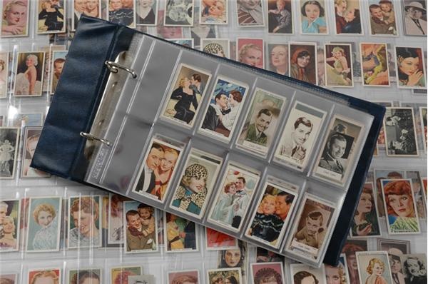 Spectacular collection is the best of the best from the British movie star issues. The shining stars of the silver screen are here in quantity and quality. There are duplicates of the great stars but also several different issues as well. There are no B-listers here, all are top stars. ALL!!! Includes: Jean Harlow (38 cards alone), Gable & Lombard, Marlene Dietrich, Greta Garbo, Shirley Temple, Clara Bow, Wallace Beery, Harold Lloyd, Fay Wray, Charlie Chaplin, William Powell, Tarzan, W.C. Fields, Pola Negri, Mae West, Barbara Stanwyck, Ana Mae Wong, Joan Crawford, Lawrence Olivier, Bing Crosby, Bette Davis, Olivia de Havilland, Fred Astaire & Ginger Rogers, and more. Actually the lot is dominated by Harlow, Gable, Lombard, and Dietrich. They are from such cigarette makers as Gallagher Ltd., Abdulla & Co. Ltd., W.D. & H.O. Wills, Godfrey Philips, Carreras Ltd., John Player & Sons, and Max. Overall a spectacular NRMT.