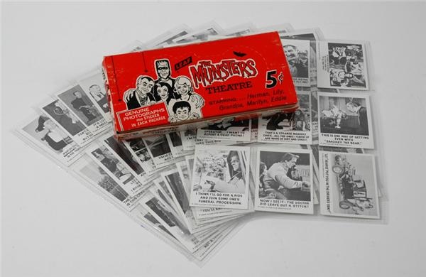 72 card set from this cult-classic is in outstanding condition. Near Mint+ set features Herman, Lilly, Grandpa, Eddie and Marilyn. Only family pet Spot got left out of this black and white issue from the first season of the show. Empty display box that housed these cards entitled 1964 Leaf “The Munsters Theatre” is in high end condition. Sports a nice illustrated lid, with some separation at two front seams.