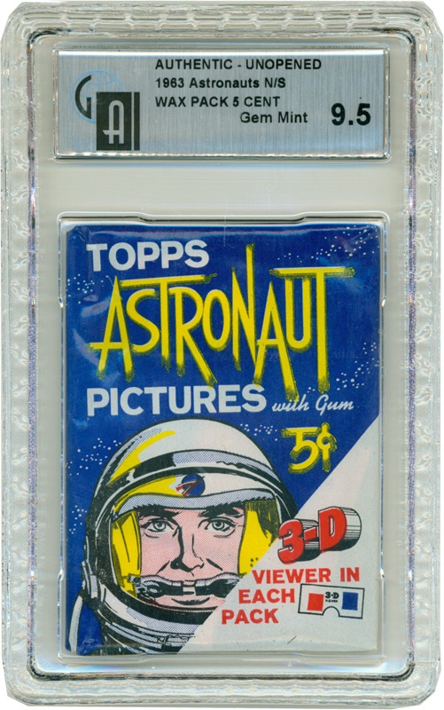 This lot consists of 15 Unopened Packs of GAI certified and Graded (all but one is graded 9 or 9.5) The breakdown is GAI 9.5 GEM MINT (5), GAI 9 MINT (9), and (1) GAI 7.5 NM+ 1963 Topps Astronaut Picture Cards. Rocket back to the dawn of the space age with these historical gems. These are extremely hard to find unopened and including the 3-D Viewer In Each Pack. “The Longer You Look the More You See!!” And there’s so much to see in this issue fronted with official color NASA photos and captions describing the selection of the early astronauts and their training. #3 of this set even includes “Testing the Chimps.” Plus the backs have the 3-D images you’ll want to use the viewer on. The familiar heroic names were included in this issue: Shepard, Glenn, Grissom, Cooper, Carpenter, Schirra and Slayton.