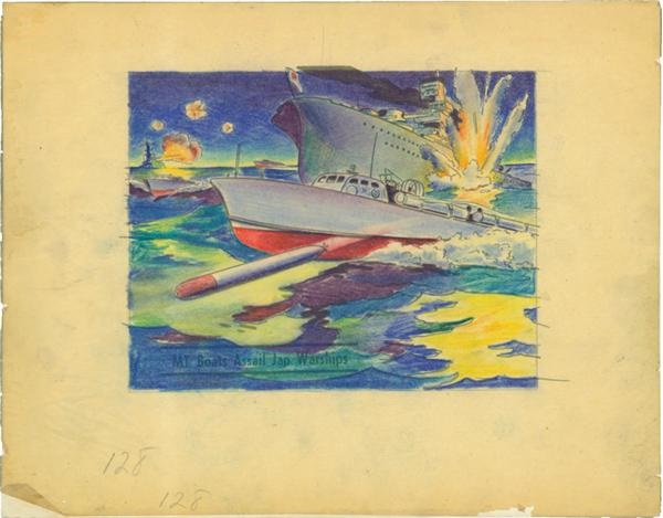 Some people followed World War II in newspapers or on radio. Others collected the war news in cards...including this dramatic episode showing boats assailing “Jap Warships.” It was one big horror show! The “Horrors of War” series was drawn by Charles Steinbacher, and produced by the appropriately named GUM, Inc. of Philadelphia, PA (a piece of gum, of course, was included in the package). Over 100 million Horrors of War trading cards were produced. All were printed from the series of original artwork pieces -- including this one. “To know the Horrors of War is to want Peace.” Those words were the slogan on the back of cards. Those difficult words also told the frightening story of what these “cards of war” signified. This piece measures 7 1/2 x 9 1/2” (approx.) and consists of the heavy black ink piece of artboard as well as the color overlay on tracing paper. The adhesive and production art smudges and pencil markings are evident.This one of a kind piece of original trading card artwork was lost for decades. The original piece of art for Horrors of War card #128 is definitely one frightening, piece of World War II history you’ll want to have.