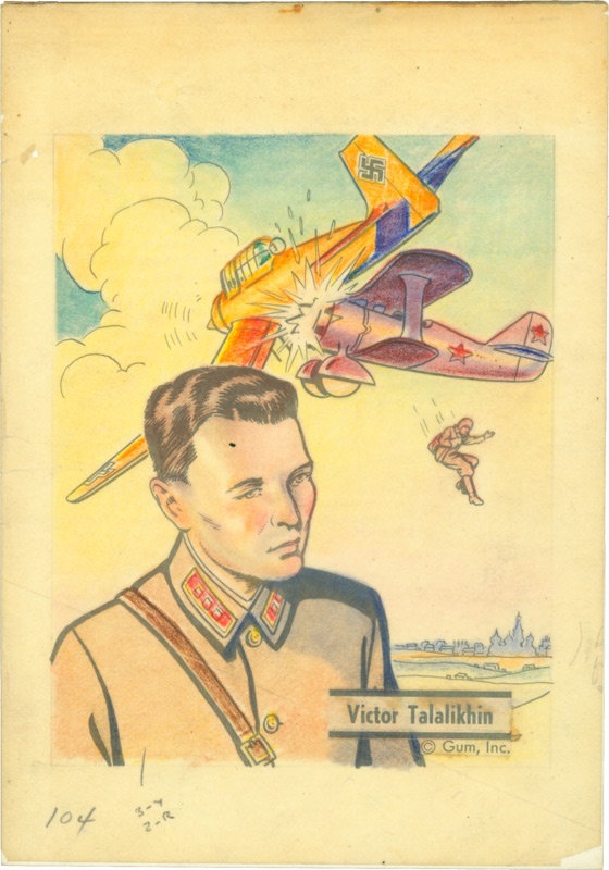 World War II lieutenant Victor Talalikhin was a Soviet Union hero. This action piece of original artwork depicts a pilot ejecting from a fighter plane after an engagement with a German plane. Another frightful cost of war as depicted in this remarkable orginal piece of artwork from the “Horrors of War” series, drawn by Charles Steinbacher, and produced by the appropriately named GUM, Inc. of Philadelphia, PA (a piece of gum, of course, was included in the package). Over 100 million Horrors of War cards were produced. All were produced  from the series of original artwork pieces -- including this one. To know the Horrors of War is to want Peace. Those words were the slogan on the back of cards. Those words also told the frightening story of what these “cards of war” signified. This piece measures 5 1/2 x 8” and consists of the heavy black in piece of artboard as well as the color overlay on tracing paper. The adhesive and production art smudges and pencil markings are evident.This one of a kind piece of original trading card artwork was lost for decades. The original piece of art for Horrors of War card #104 is definitely one frightening piece of World War II history you’ll want to have.