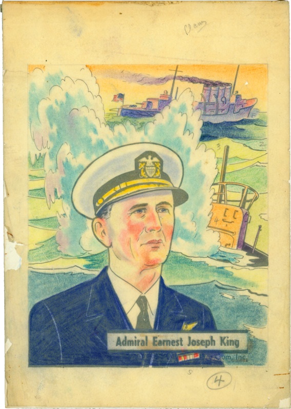 Talk about proving your mettle, US Congressional Gold Medal recipient Admiral Earnest Joseph King was a true all-American hero. Not surprisingly, he was given this card! With explosions blasting behind this impressive artistic rendering, Admiral King was one piece of original artwork in this historic series. The “Horrors of War” series was drawn by Charles Steinbacher, and produced by the appropriately named GUM, Inc. of Philadelphia, PA (a piece of gum, of course, was included in the package). Over 100 million Horrors of War cards were produced. All were produced  from the series of original artwork pieces -- including this one. “To know the Horrors of War is to want Peace.” Those words were the slogan on the back of cards. Those words also told the frightening story of what these “cards of war” signified. This piece measures 5 1/2 x 8” (approx.) and consists of the heavy black ink piece of artboard as well as the color overlay on tracing paper. The adhesive and production art smudges and pencil markings are evident.