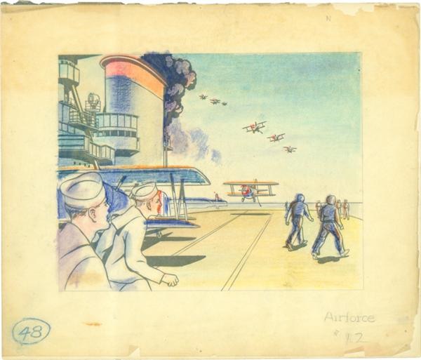 Fighter Pilots...A busy aircraft carrier.... Seamen in action. This is one piece of original artwork from the Uncle Sam World War II military series produced by GUM of Philadelphia. All these military training maneuvers were part of the successful series of gum cards. This one is the original 7-1/2 x 9” (approx) art board consisting of the black ink drawing as well as the color overlay that was used to print the Uncle Sam Card #48. The adhesive and other art markers can be seen on the back and front. Salute the American military with this original piece of American pride.