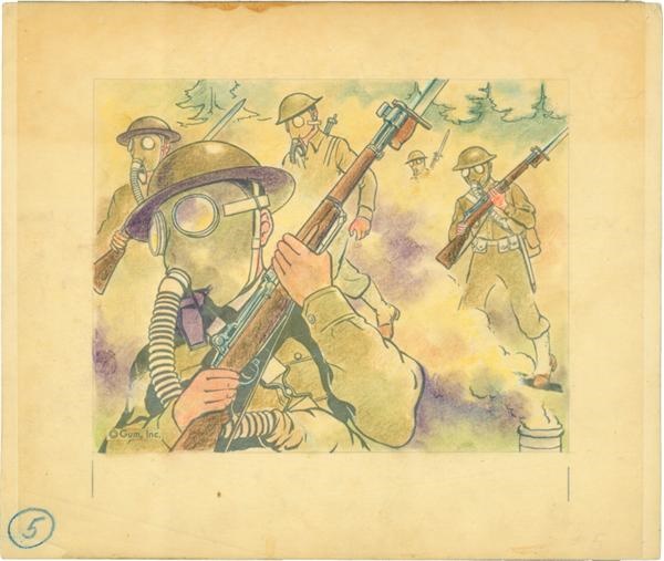 World War II defense training never looked as dramatic as when it was viewed in this series of Uncle Sam Original Art from GUM of Philadelphia. Here you see five soldiers, obviously well covered and face-protected carrying their rifles on a training maneuver. The heavy line ink is on the original 7 1/2 “ x 9” artboard and is covered by the color overlay on tracing paper. Adhesive and other marks showing are part of the production process.
