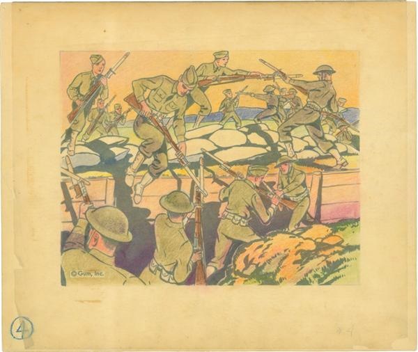 Salute the military pride of these World War II training maneuvers. This piece of original Uncle Sam artwork from GUM of Philadelphia shows an action scene of soldiers in a fighter training situation. This is the original 7 1/2 x 9” (approx) artboard consisting of the black ink drawing as well as the color overlay that was used to print the Uncle Sam Card #4. In fact, the adhesive and other art markers can be seen on the back and front.