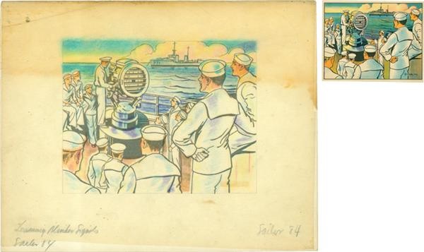 This series of cards depicts Uncle Sam’s soldiers, sailors, marines, airmen and civilians in training for National Defense. One of the cards--this one-- is titled “Blinker Signals.” It shows how Naval recruits learn their dots and dashes --how to send morse code messages. We learn that signals are visible for 20 miles. This piece of original art, along with the NRMT card, shows the class onboard a ship. The original artboard measures approx. 8 x 9 1/2” . It consists of the original black & white illustration and the color overlay on tracing paper. There are some adhesive and other art smudge marks on the front and back along with a pencil written caption on the lower front. This is a dramatic look at World War II rarely seen.