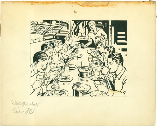 Soups On! It’s a delicious side of the military that was part of the training. Note how orderly, polite...and hungry these sailors are as they obviously take a much needed break from their defense maneuvers. This is one powerful piece of original artwork from the Uncle Sam World War II military series produced by GUM of Philadelphia. All these military training maneuvers were part of a successful series of gum cards. This one is the original 7 1/2 x 9” (approx) artboard consisting of the black ink drawing (there is no color tracing paper overlay which would have been needed to print the Uncle Sam Card #80).