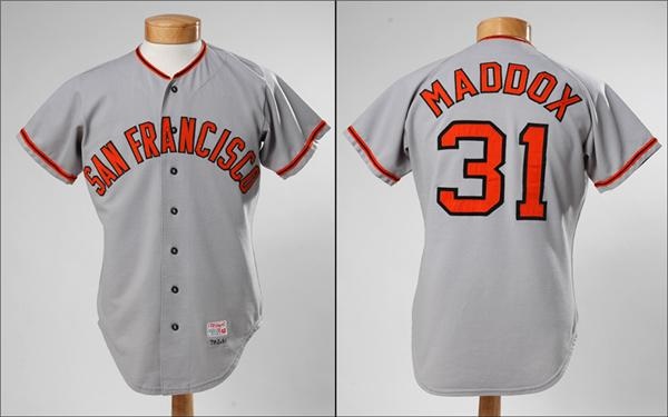 1973 San Francisco Giants road knit of star outfielder Garry Maddox here. Great wear evident, with all proper tagging, including Wilson size 40 in tail, “73 Set 1” underneath on swatch. “Maddox” chain stitched in the collar. NOB above Maddox’ #31. Nice fade to orange colors on letters and numbers from repeated wears and washings. Super style Giants shirt from the early 1970’s.