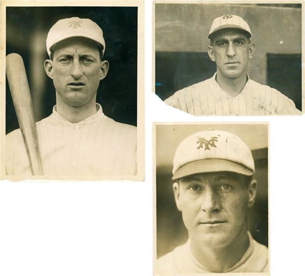 These 1920s-era photos of three major leaguers from the time, recall a league where the spikes-up, kill-or-be-killed style of play ruled the day, and booze, cigars, gamblers and nightclubs ruled their nights. Benny Kauff, `the Ty Cobb of the Federal League’ played hard, partied harder and ran with a rough crowd during his time with the New York Giants, which ended July 2 1920 when he was banned for life for his role in a stolen car ring. New York Giants pitcher Slim Sallee, was a junkballer with great control who writers said would rather stop playing than stop drinking. Roger Peckinpaugh, was considered among the best shortstops in the American League with the New York Yankees and at 23, even managed the club for 14 games in 1914. Photos are black and white and are G-VG. Kauff’s photo is 6-1/2 X 8-?” and has some surface scratches. The back includes his last name and stamp by the photographer, Paul Thompson. The Sallee picture is 8 X 10” with slight staining and tears at the bottom border. The back of the photo includes his name and a stamp from the New York Tribune. Peckinpaugh’s photo is 6-1/4 X 8-1/2”. A three-inch section of the lower left corner has been torn away. The back includes a date stamped Oct. 5, 1921 as well as stamps for the Philadelphia Inquirer and The Sun and Herald Syndicate.