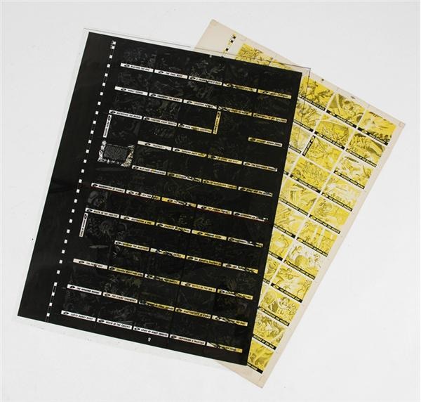 From the Topps archive comes these very cool film-strip quality color separation sheets from this legendary and rare complete 55-card set of 1962 Mars Attacks cards. The graphic depiction of sadistic Martians destroying everyone and everything in sight on the doomed planet Earth were a hit with kids but not with parents. They were pulled from store shelves and discontinued not long after their release. The three sheets are each 22 X 29” and have very minimal wear due to proper storage. One sheet film quality sheet is black and clear and was probably used as a guide as to where the black ink was to be. The other filmstrip quality sheet was probably used for the yellow ink. Lastly there is the yellow test sheet on thick cardboard stock. The piece will make a nice addition to any printing proof or test issue collection.