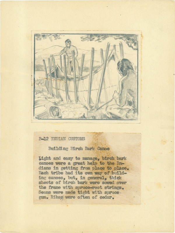 Getting from here to there meant building a birch bark canoe. Which just happens to be the story behind card B-12 titled Indian Customs. This original pencil sketch is one of the immensely popular Wild West Card series. The hand-drawn pencil sketch was colorized and used to produce the actual trading card which was sold in a package along with the ever-popular piece of gum! This sketch is NRMT and has some minor adhesive smudges. Below this pencil sketch is the typewritten paragraph telling the story behind building the birch bark canoe. These words were printed on the reverse side of the finished card.