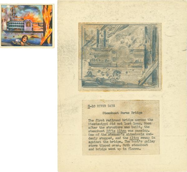 Itβs no wonder that a series of Wild West Picture Cards with Gum were the hottest thing is trading cards since the gold rush itself. Take this one-of-a-kind original pencil sketch. This remarkable hand drawn sketch was the exact piece of art that was then colorized and turned into card number G-10. The artwork and the card itself--titled Steamboat Burns Bridge--are teamed up in this amazing collection. The card measures (approx) 2 x 2 1/2β and is in NRMT condition. On the rear side is a nine line explanation telling the story behind the fire that took place when the steamboat swung in against the first railroad bridge built across the Mississippi River. The original pencil sketch measures approx 3β x 4β and has the original typewritten working that was used on the printed card.