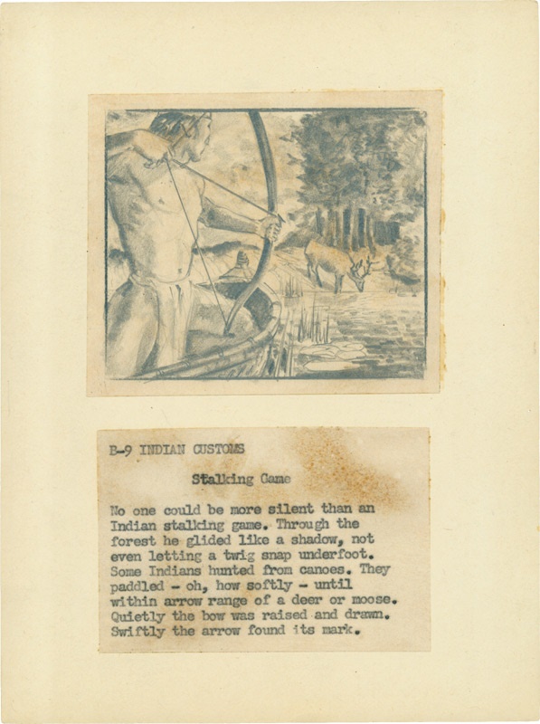 Shhhhh! Be very quiet. This original piece of pencil artwork shows the Indian Custom of Stalking Game. Silence is golden! In order to successfully hunt, the Indian was extremely quiet--not even letting a twig snap underfoot. This delicate, hand-drawn pencil sketch beautifully recreated this wonderfullly successful Indian custom. As pencil sketch number B-9, it was later colorized and produced as part of the popular Wild West trading card series. Measuring 3 x 3 1/2”, the artwork has some minor adhesive smudges as part of the production process. Below the artwork is a typewritten copy block--a paragraph that tells the story of Stalking Game.