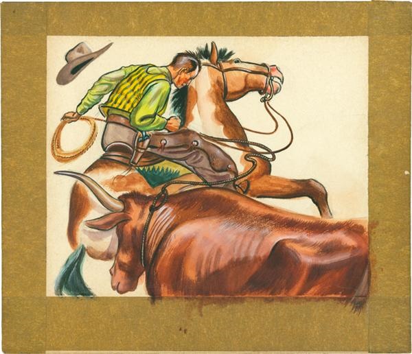 As popular as the Bowman cards have been for collectors (in their 1950 newsletter, Bowman even wrote that complete sets in perfect condition will became more and more valuable as the years go on) that prediction doesn’t even take into account the rarest of the rare opportunity to stake your claim on a piece of original Wild West artwork. This gouache sketch even has some of the artist pencil marks and is in NRMT condition. Measuring 6 1/2” x 7 1/2”, any smart collection should quickly lasso this piece!